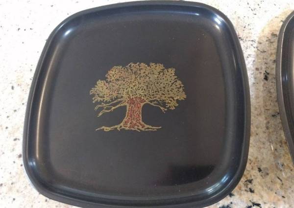 Tray by Couroc of Monterey. Couroc is a black resin that is decorated with various things like wood, strips of metal, coins Etc. Very attractive and unique trays. They all have the shiny black background, the photos don't show it well.