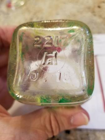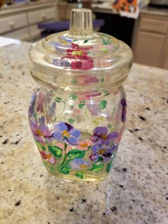 Vintage Hazel Atlas jar, hand painted with a floral design and initialed "B.R." It has a round lid and square bottom. The handle of the lid is ribbed. It has the "H" over "A" mark on the bottom with the number 2217 and O 18 which I guess stands for Oakland factory. It is about 4.5 inches tall.