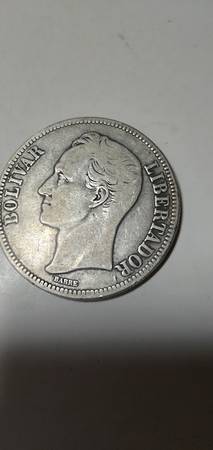 1936 Venezuela 5 Bolivares coin is .900 silver and is the final year of Venezuela's large silver "Fuerte" coinage. The coin features a portrait of Simon Bolivar, a national hero of Venezuela. $50