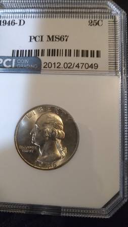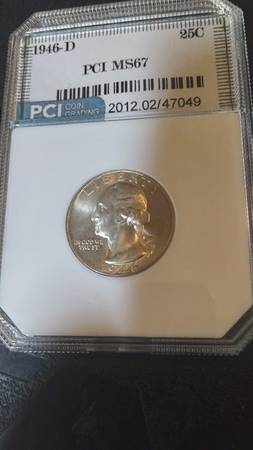 1946-D Washington Quarter, U.S. coin minted in Denver. Made with 90% silver, graded MS67 by PCI Coin Grading, indicating a high level of preservation and uncirculated condition. $150