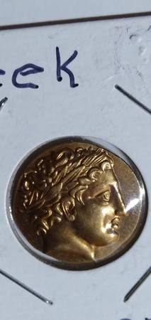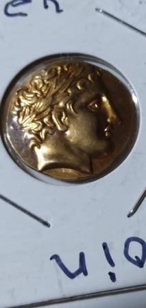 The coin of Philip II of Macedon. The coin depicts a charioteer driving a biga (two horse chariot) on the reverse side, commemorating Philip II's victory at the Olympic games. I purchased this coin from an auction and they don't certify coins, but this one looks uncirculated. Since it isn't graded it could be original or a very good replica with intricate detail. $38 B/O