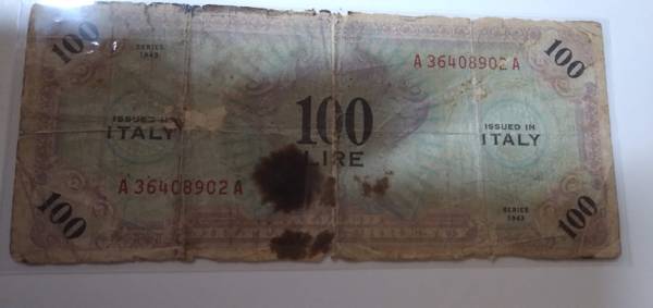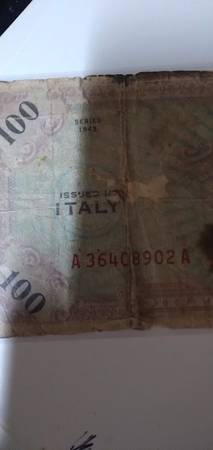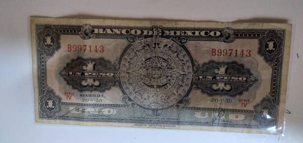 3 different vintage banknotes; Mexican 1 Peso banknote issued by the Banco de Mexico, specifically from the 20-V-59 series; 1978 One Shekel Sir Moses Haim, Bank of Israel: 100 Lire banknote issued in Italy during 1943, Allied Military Currency, it has a stain and is well circulated shape. Overall they are all in fair - good condition. $15 for all