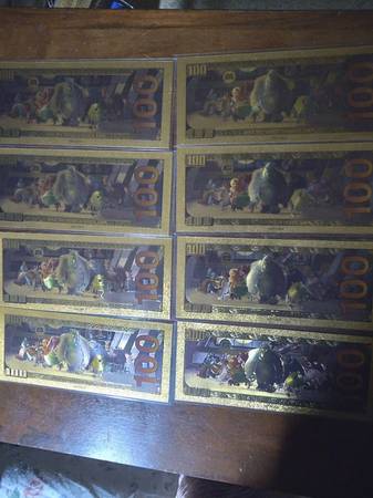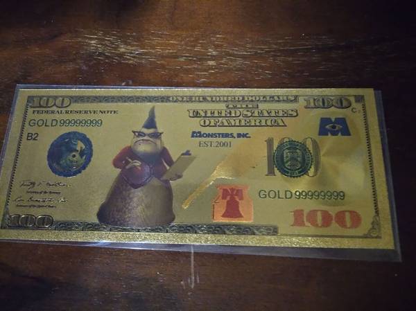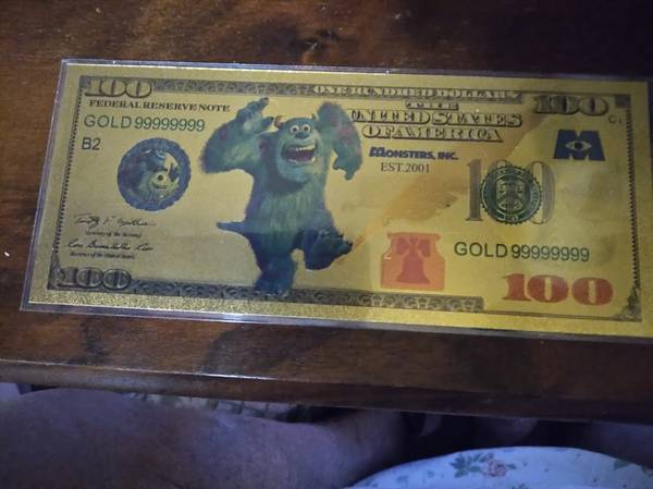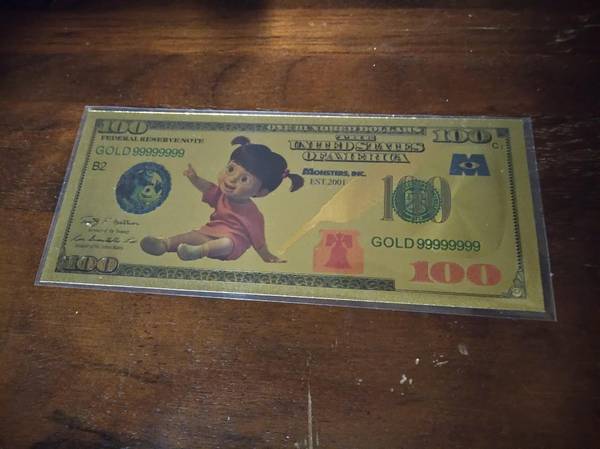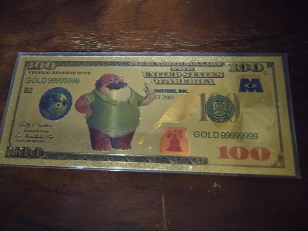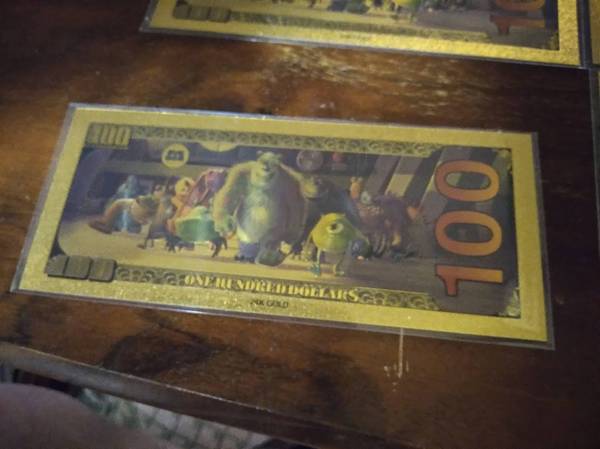 A collection of 24kt. gold foil representing characters from the Monsters Inc. film from 2001. These bills have a $100 bill design with a gold foil covering. This is a nice complete collection of gold foil bills in like new condition. Each one in it's own protective sleeve. $50