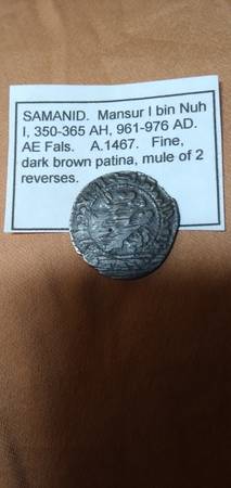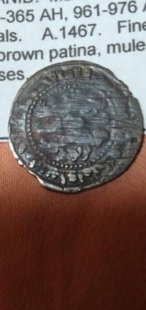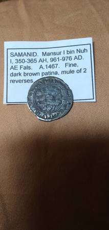 This coin was made during the rule of Mansuri I ibn Nuh, 350-365 AH (961-976 AD) of the Samanid dynasty, A Persian Sunni dynasty that ruled in Central Asia and parts of Iran. A very ancient coin, for the age it is Fine with a dark patina. A great historic artifact. $25