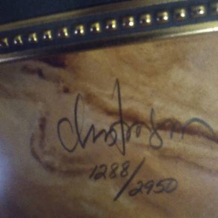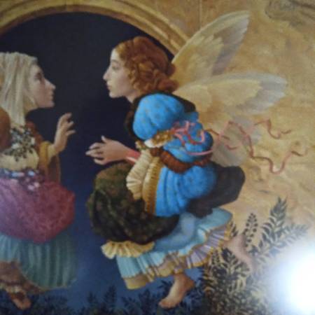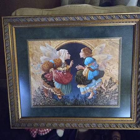 This print is number 859/2950 and signed in pencil by James C. Christensen. It is in his usual whimsical style. Limited Edition Lithograph. It was made in 1990 and styled after the works of the Renaissance artist Sandro Botticelli. Framed with a gold tone frame and a green marble look matte. About 15.75"x12" without the frame and 24"x20" with the frame. Fits great in any art collection