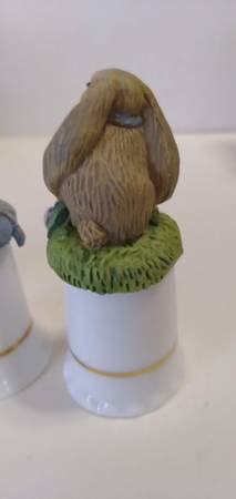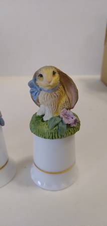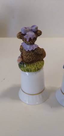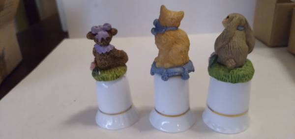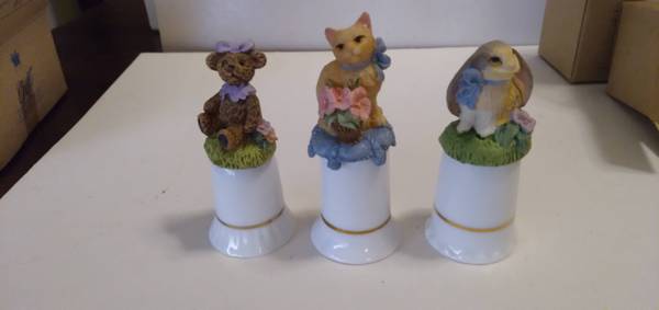3 Avon thimbles, a bear, a cat, and a bunny are what tops the porcelain bells which also have a 22K gold ring around them. They are beautiful, like new, and come in their original boxes. About 2.25"...