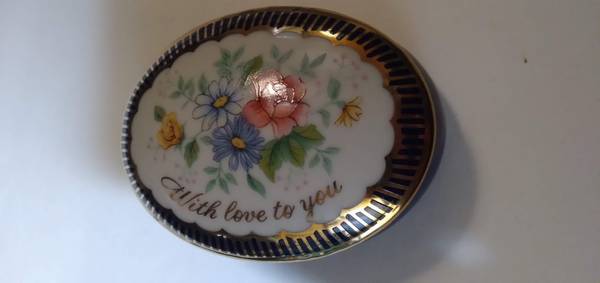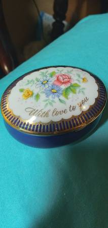 Titled "Message of Love" This keepsake or trinket box is made from fine porcelain, Cobalt Blue and trimmed with gold, on the bottom inside written in gold it says, Mother's Day 1986. First time out of box since 1986, for the pictures, so it is perfect, comes in original box.
