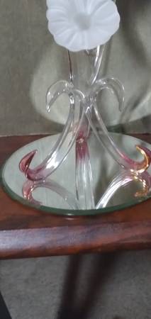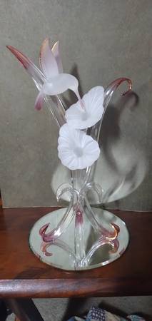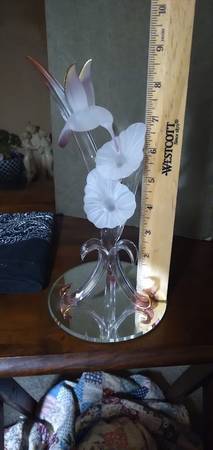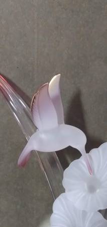 On a mirrored base, Handcrafted by Glass Baron. It features a frosted glass hummingbird with 22k gold on the tip of the wings and tip of tail feathers. The hummingbird is in the process of feeding on two frosted glass flowers that are connected to clear, curved glass leaves. It is a beautiful handcrafted sculpture. $20 B/O
