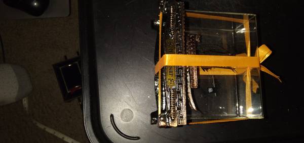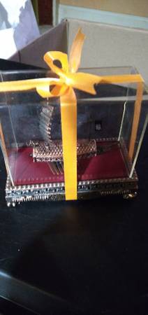 Vintage Metal Korean Turtle Ship. Desktop miniature Bronze Ship setting on red velvet and bronze base. It has a plexiglass cover to protect it ($40)