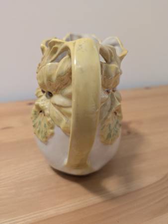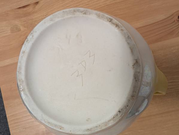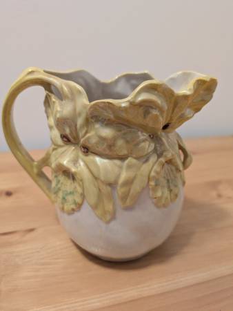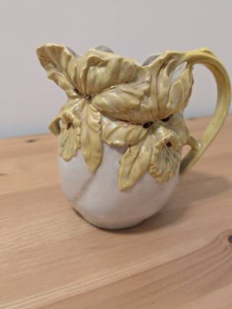 Vintage Ceramic Flower Motif Pitcher Slightly iridescent glazing Number 48, indistinguishable makers mark, and MAM initials on bottom Approximately 6-1/4" high x 6-/12" long x 4-1/2" wide No cracks,...
