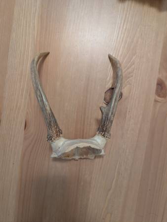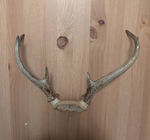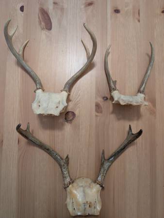 White tail deer antlers. For display or use for crafts. Three available: 6 point approximately 9" wide x 9" high - $20 6 point approximately 12" wide x 10" high - $20 3 point approximately 5-1/2"...
