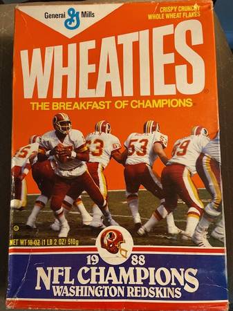 Vintage collectible unopened cereal box. 1986 Champions Redskins Wheaties. In very good condition. From a pet and smoke free home. Cash and pick up only. Mail available add postage handling.