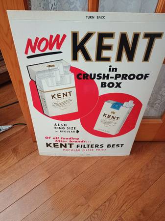 Very nice cigarette cardboard signs. First is a Chesterfield cigarette sign from the 50's in a frame. Sign measures 20" x 21" and the Kent sign is also from the 50's and Measures 19" x 28". $100 each
