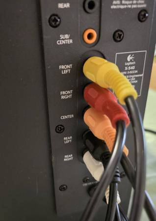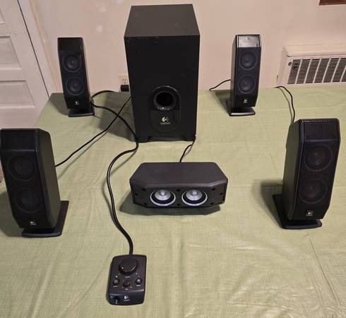 Very Nice surround sound speaker system with 6 speakers: 2 Front Speakers, 2 Rear Speakers, 1 Center Speaker, 1 Subwoofer Speaker Looks nice and works great. Hook up to your computer, cellphone, or...
