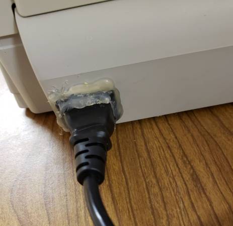 Second machine power cable jack was damaged, strong repair with hot glue, works perfect. See last picture.