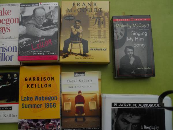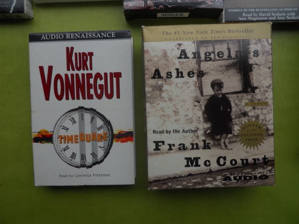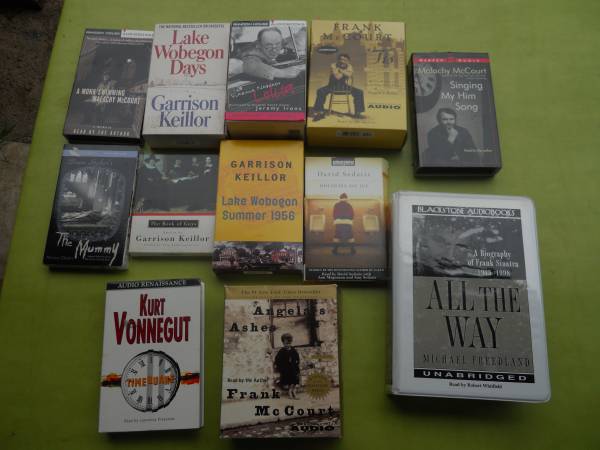 12 books on tape, on cassette. See photos for titles -- some good stuff, ideal for anyone with a cassette player in their car or home. $15
