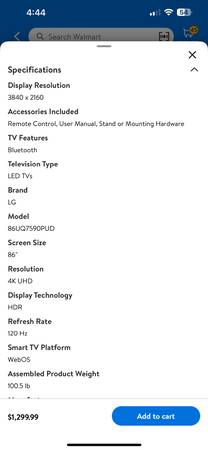 Brand new still in the box 86’ LG TV . No low ballers or resellers I’m not desperate to sell so I’m not selling it for pennies on the dollar ! The picture is of the price Walmart is selling this tv for right now so $900 is a hell of a price retail with tax would be $1376.94 !