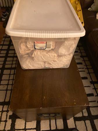 Container of 50+ Christmas ornaments from Pottery Barn. Assortment of silver with purple accents and glass ornaments.