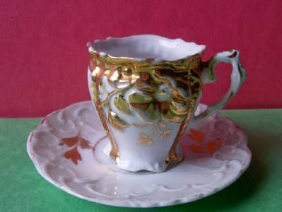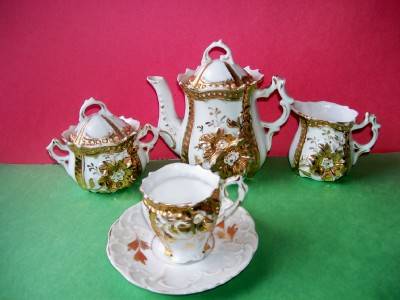The Teapot is 4-3/4 inches high, the covered sugar is 3-1/2 inches high, the creamer is 2-1/2 inches high, the saucer is 4 inches round, and the cup is 2 inches high. All in perfect condition.
