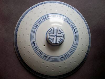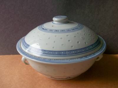 It is 8-3/4 inches round and 6 inches high with lid. It has 4 unique elephant head handles. Absolutely perfect condition.
