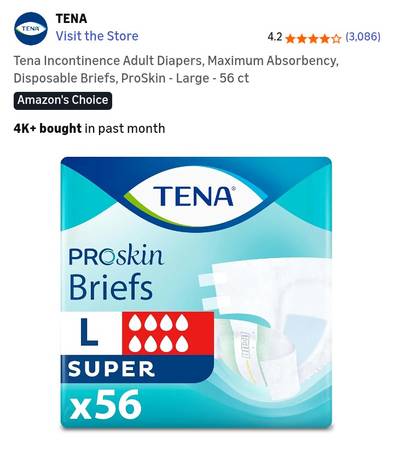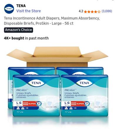 Tena Incontinence Adult Diapers, Maximum Absorbency, Disposable Briefs, ProSkin - Large - 56 ct...NEW IN BOX