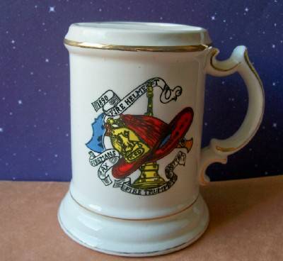 This colorful mug features an antique Fireman's Ax, 1890 Fire Helmet and 1877 Fire Trumpet. It is 4-1/4 inches high and in perfect condition. If this ad is up, it is available.