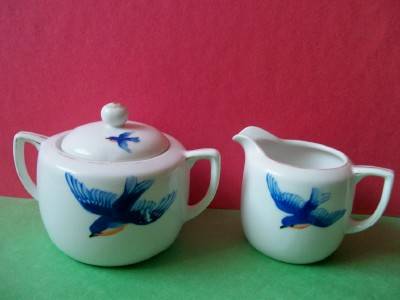 The covered sugar measures 3-1/2 inches high and 5 inch wide, including the handles. The creamer is 2-1.2 inches high and 3-1/2 inches wide, including the handle. Absolutely spotless, with no chips...