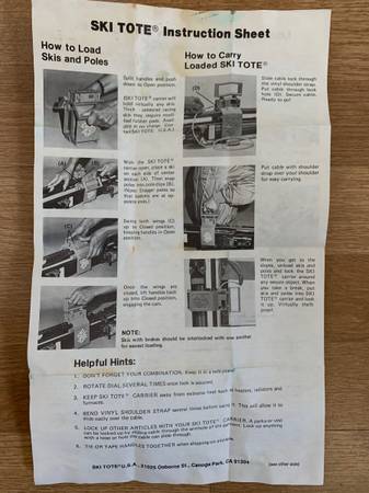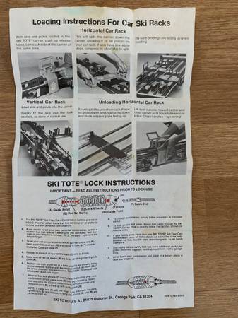 Ski Tote Locking Transport System Car Top and Carrier One Ski Tote Carrier is good condition. One Ski Tote Carrier is fair condition, Free One Cable Combination Lock is good condition. Take all...