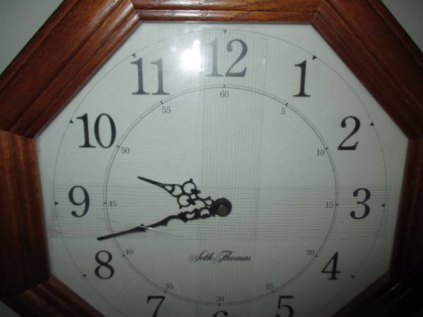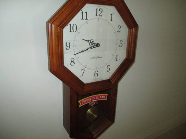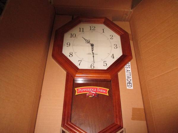 Pepperidge Farm logo can be removed. Seth Thomas wall clock 23" tall by 13.75" wide. Wood oak finish. Quartz movement ( battery powered). Never used and still in original box.