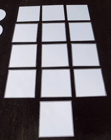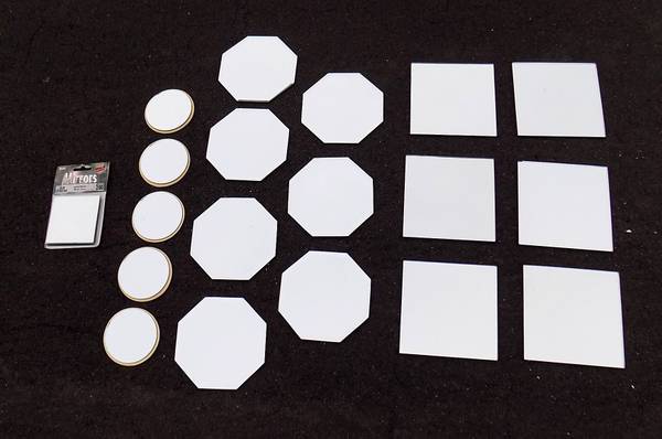 Group of table mirrors - a new 5 pack of 3 inch square mirrors, five 3 inch round mirrors with backs, seven 5 inch octagon mirrors with pads, six 5 inch square mirrors with pads, two 5-1/2 inch mirrors with borders, eleven 6 inch round mirrors, eight 10 inch round mirrors and thirteen 12 inch square mirrors with sequined borders - $50 for everything.