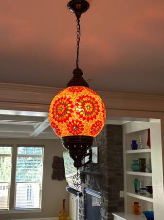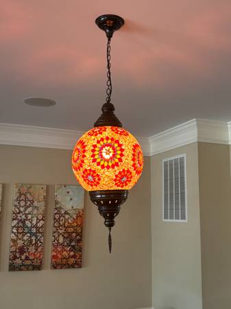 Turkish glass lamp purchased in San Diego about 5 years ago for about $600. Glass ball about 12 inches in diamter. Structure about two feet top to bottom. The bottom part can be removed so the glass ball is the bottom. Chain a little less than a foot. We love it but are redoing our dining room where we had this as the chandelier.