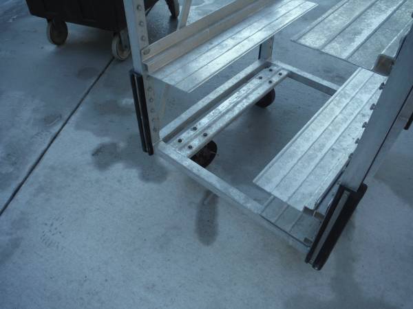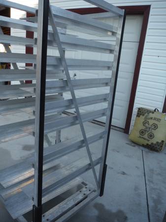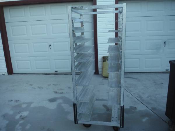 It is full-size, made of aluminum and has adjustable shelves, bumpers and of course wheels. Speed racks are racks that hold sheet pans in a vertical stack. They can function as a cooling rack where baked goods are allowed to cool, or where the temperature of chilled ingredients can be raised to room temperature. But its best function is the easier transport of products inside the kitchen. $100 Cash Only (OBO), Call Robb