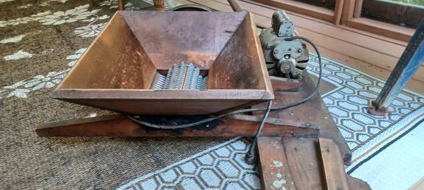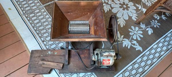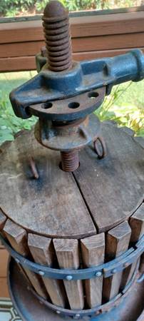 Heavy cast iron and wood wine press made by Berarducci Bros Mfg. Co. from Mckeesport, PA. as seen on the leg casting. It is a high quality wine press and appears complete with all the hardware, wood blocking and platter needed for use. It is very well made, sturdy and in good condition for its age, with some wear from use and darkening from age. The crusher is by American Acme Co. from Emigsville, Pa., just visible as painted on side. It is motorized with a vintage electric motor by Montgomery Ward, in running condition. It has wear and tear from use, areas of repair, all consistent with its age. Both were last used by grandparents for wine making in the 70’s. They show great and are ready to be put to use for wine, cider, etc. or as decorator pieces in your wine room. Please look at the photos carefully. Sold as is. $800/OBO