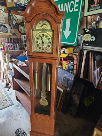 The clock keeps pretty good time. The chime system works but needs some adjustment. The weights are only decorative. $95. Please call between 9am and 7pm. Thanks