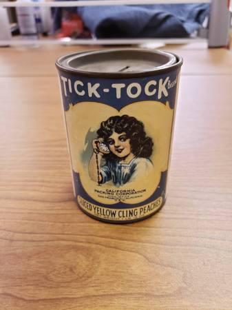 Lot #3 ($15) Vintage TICK-TOCK Brand Sliced Yellow Cling Peaches Tin Can Bank approx 4" Tall, 3" Diameter