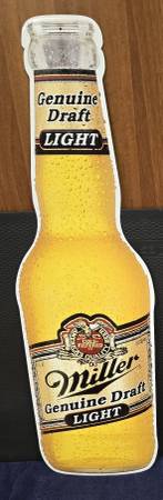 Six (6) new, all flat metal Miller Lite beer signs. All have sticky pads on the back for easy mounting to a wall. You get all 6 signs: 4 separate beer bottle signs 2 separate beer can signs