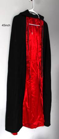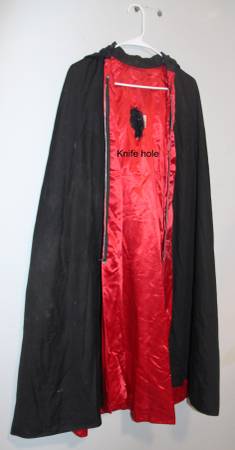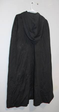 Hooded Black cape with red liner, 45 inch costume. Knife Hole center of back left over from theater play. Age ware from the 1940s may have tears etc.