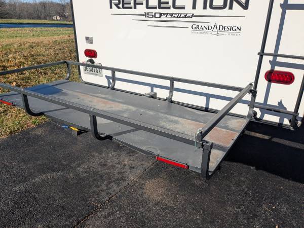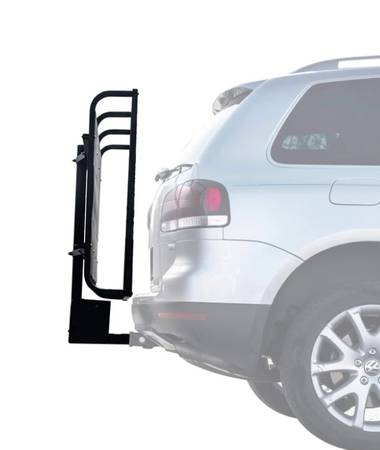 Super-large and versatile folding hitch rack for all passenger vehicles and motorized RVs, carries bulky gear and equipment. Industry largest capacity fits trikes, wheel chairs, carts and scooters, tons of cargo and so much more.