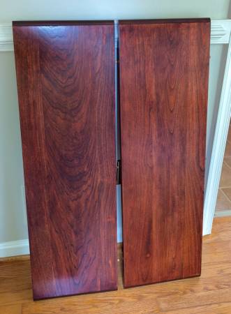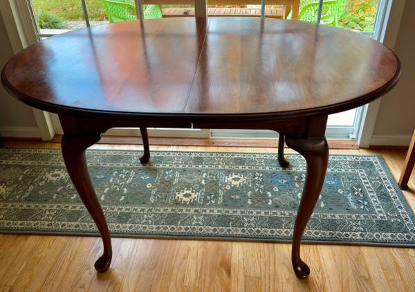 Solid Cherry Dining Room Table from Gardiners Furniture, mid 1990s. Extends to include one or two additional table top leafs. Beautifully finished and real wood. 52" x 38" plus two 12" leaves, providing varying lengths of 52", 64" and 76". Cash only. Pick-up only. Excellent condition $120.
