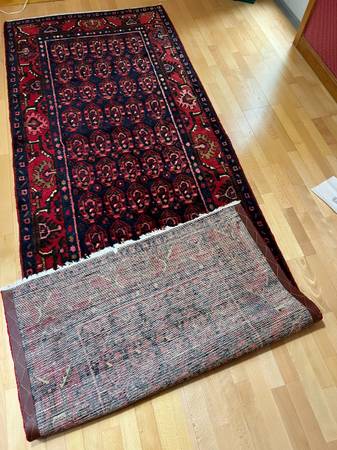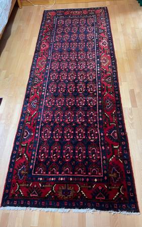 100% wool oriental carpet, probably from Iran (based on the missing label formerly attached with staples). Beautiful vibrant colors, size 10'4" x 3'9" from a smoke-free and pet-free house.