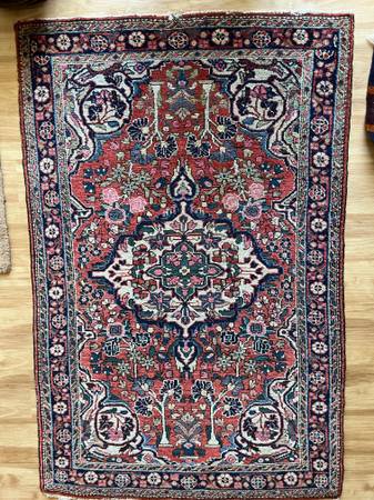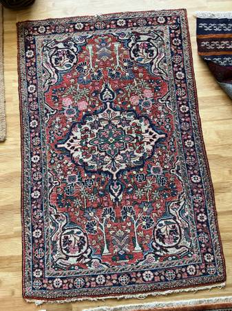 Genuine Persian rug, 100% wool. Fringe is unraveling in places (see photo), but still beautiful. Size is 6'7" x 4'5" from a smoke- and pet-free house.