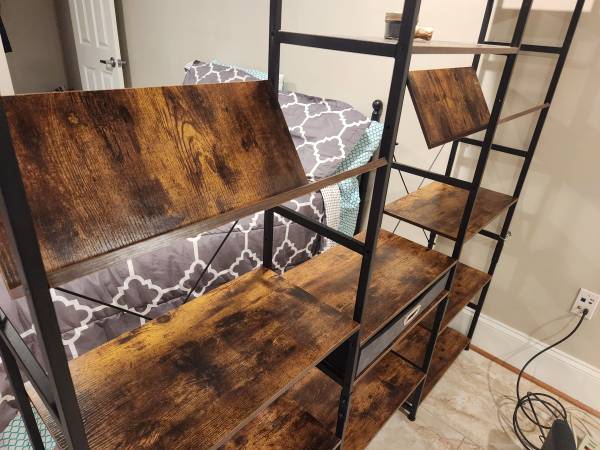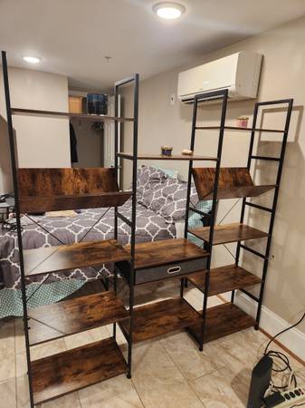 Angled bookshelves, comes with a fabric drawer. Cool looking. 12" front to back, 67" tall, 64" wide. Assembled until 09/30 or disassembled with instructions after Pick up in 21201 Park and Center...
