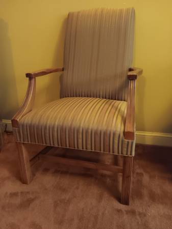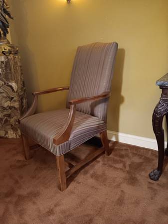 set of six chippendale dining chairs, all arms , fully upholstered, all grooved legs and stretchers , fine condition