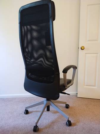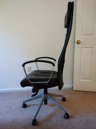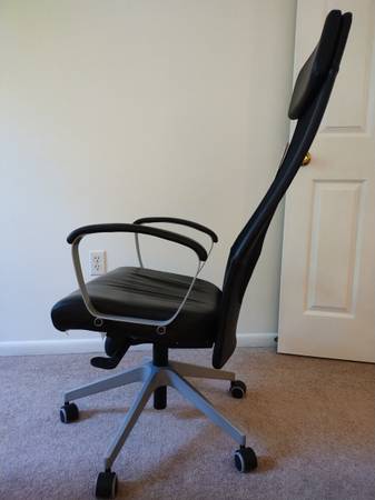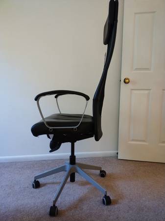 Black Ikea chair purchased As-Is 3 days ago for $89; it doesn't fit my desk as I'd hoped. New price is $299. Photos show it straight up, fully reclined (it locks at half-reclined too), and fully raised. The seat, arm and head rest covers are 80% leather and 20% artificial leather, per the label under the chair. Please respond with date and time you want to see it/pick it up. Cash payment only please.