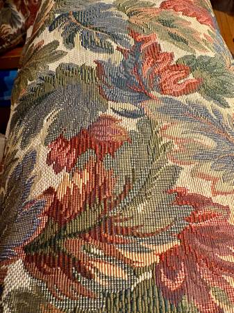 Floral pattern upholstered sofa 3 seat size sofa - 3 each seat and back cushions 2 bolster cushion each end All cushion covers can be removed 0ver 10 years old, traditional style Sofa clean; no rips...
