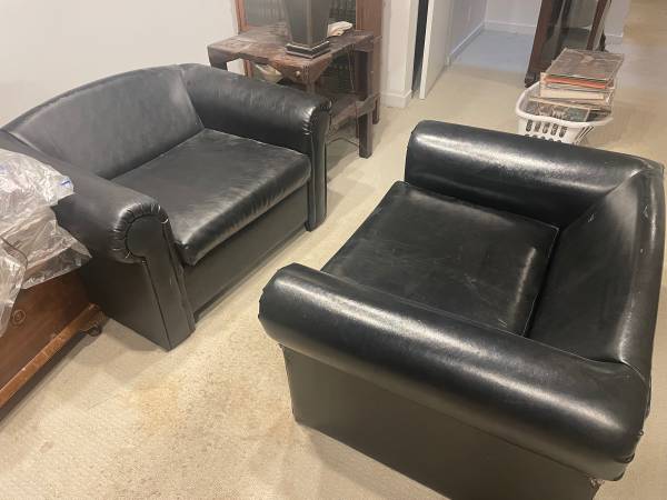 2 lounge chairs, Naugahyde. Some wear, cat damage, could be slip covered. Pull-out cot sized beds, one needs work on spring mechanism. $75.00 each, or best offer. You move/pick-up. Additional photos...