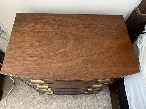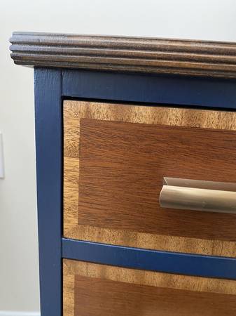 $150 each or $280 for the set - vintage (circa 1950's?) oversized 4-drawer nightstands which have been refinished. Features navy blue paint with gold foot paint accents and new brass handles. Drawers are lined with navy/gold floral print as shown. The painted and stained wood have been sealed with 3 layers of water-based polyurethane. They measure 30" tall, 24" wide, and 15" deep. These are from a smoke-free household. Please feel free to message with any questions