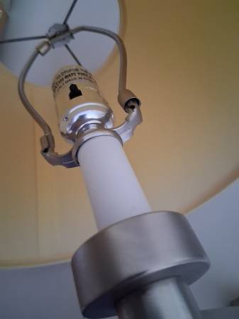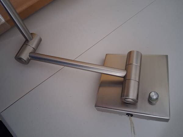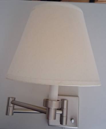 Brushed Nickel in great condition. The two joints let the lamp swing in all directions to make for a great reading light. Pull it away from the wall of push it back against the wall as you need.
