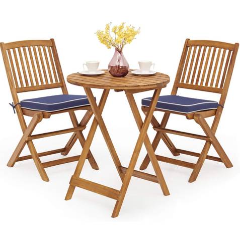 3 PCS Patio Folding Bistro Set, Outdoor Acacia Wood Chairs and Table Set w/Padded Cushions & Round Coffee Table, Ideal for Indoor Patio Poolside Garden (Navy Blue). Product Size: ~see picture...