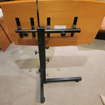 Equiped with wheels. Easy to move around Great for laptops Cherry finish Approximately 31 inches wide. Easy to stow away when not needed Cash only